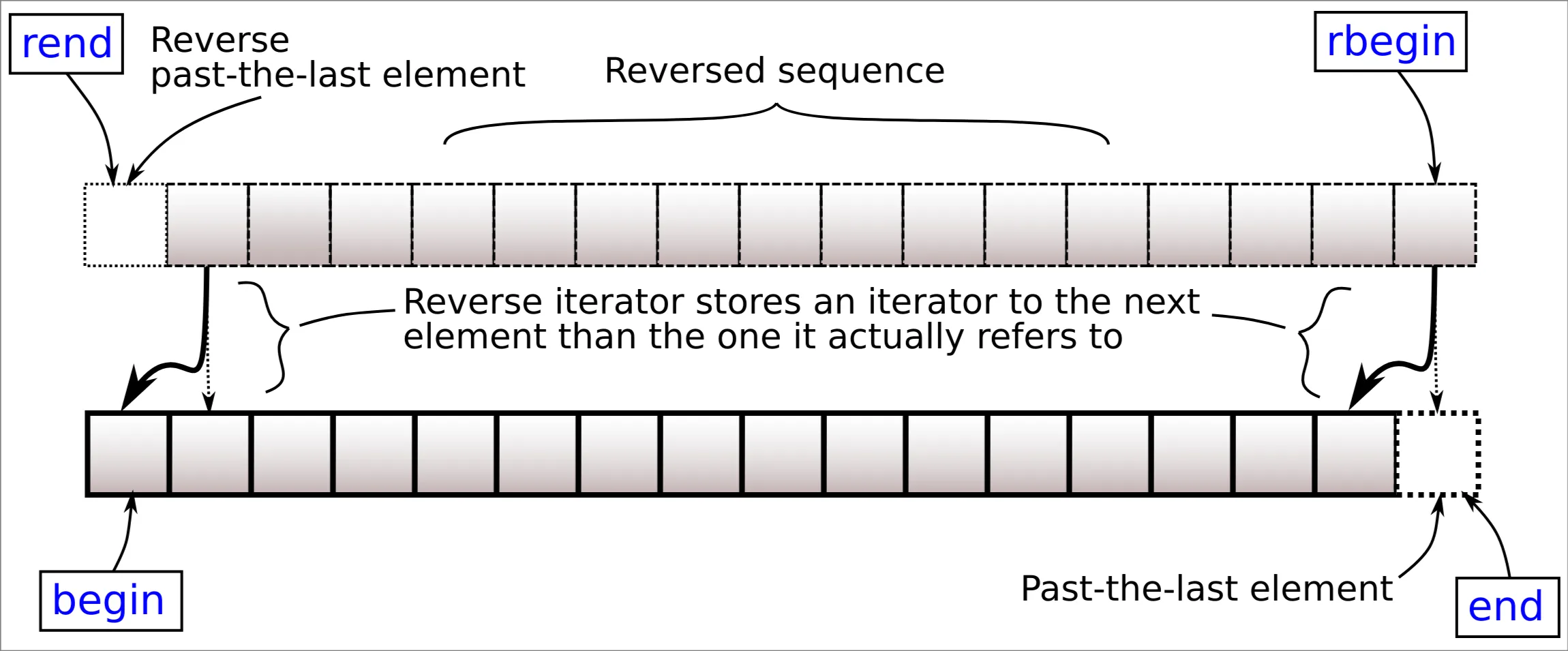 .rbegin(),.rend(),.crbegin(),.crend(): reversed iterator, i.e. iterate backwards.