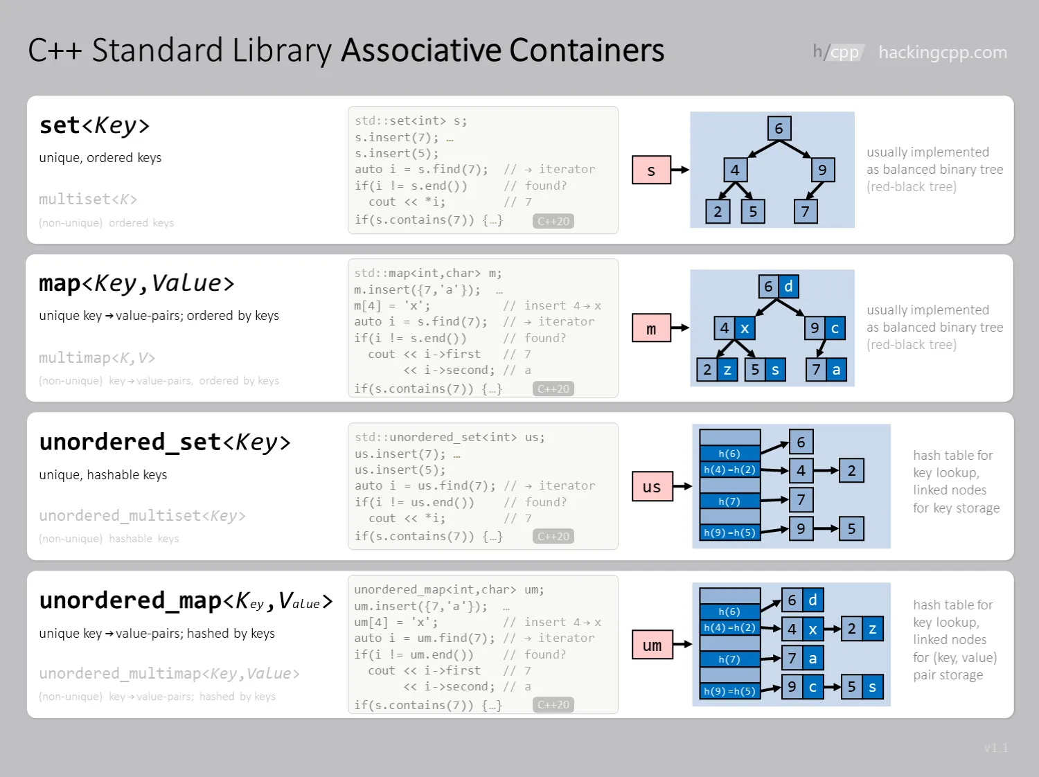 std::pair<iterator, bool>..insert({key, value}).insert_or_assign(key, value): overwrite..emplace(params): the params are used to construct pair..try_emplace(key, params): the params are used to construct value.- You can also provide a hint iterator for insertion.