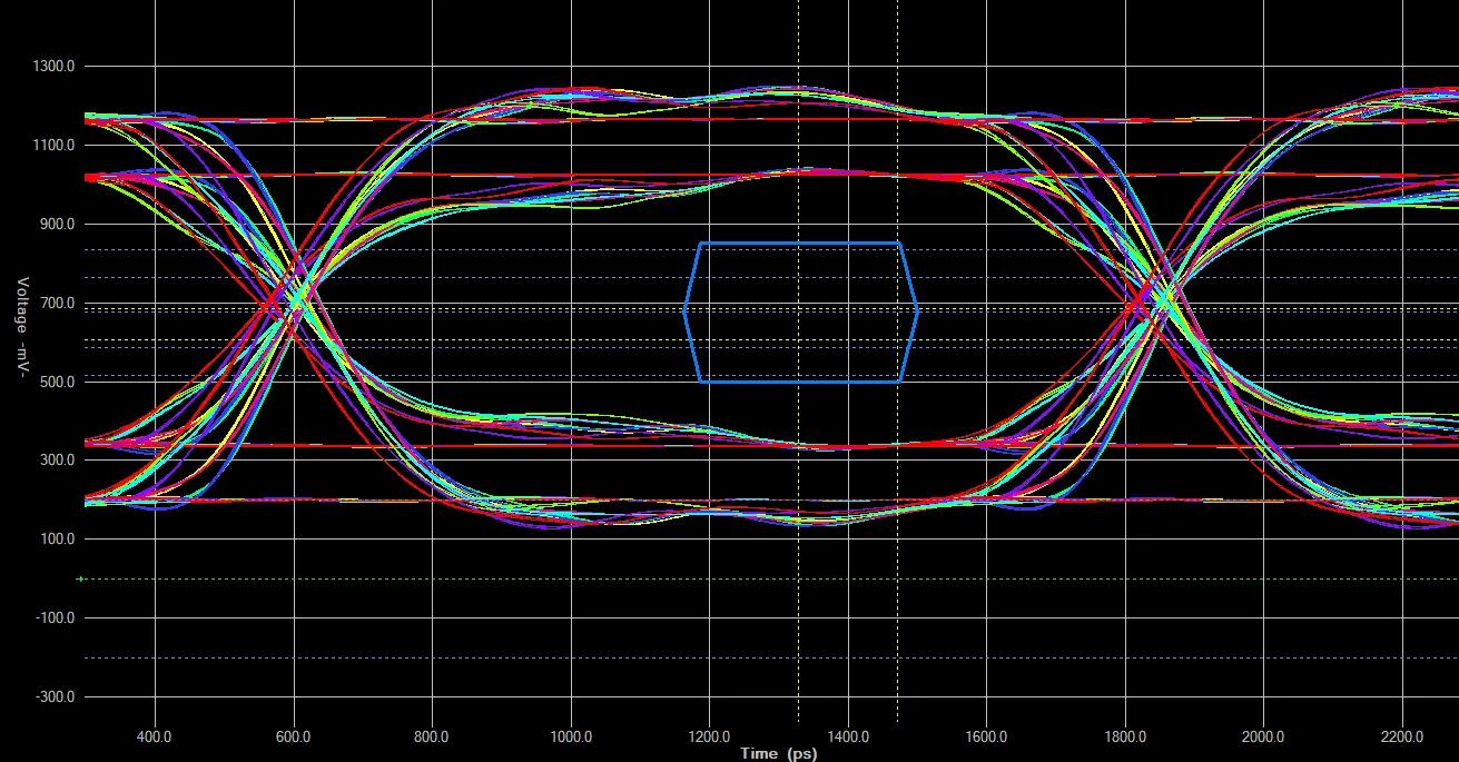 这张眼图显示了一个经过严格长度调节的单个数据组, 但信号完整性较差. 绿色的信号表示从 DRAM 芯片的裸片上看到的选通信号. 蓝色的眼表示 DDR3L 内存在 DDR3-800 工作时, 围绕时钟过渡点的 AC175 电平设置和保持时间.